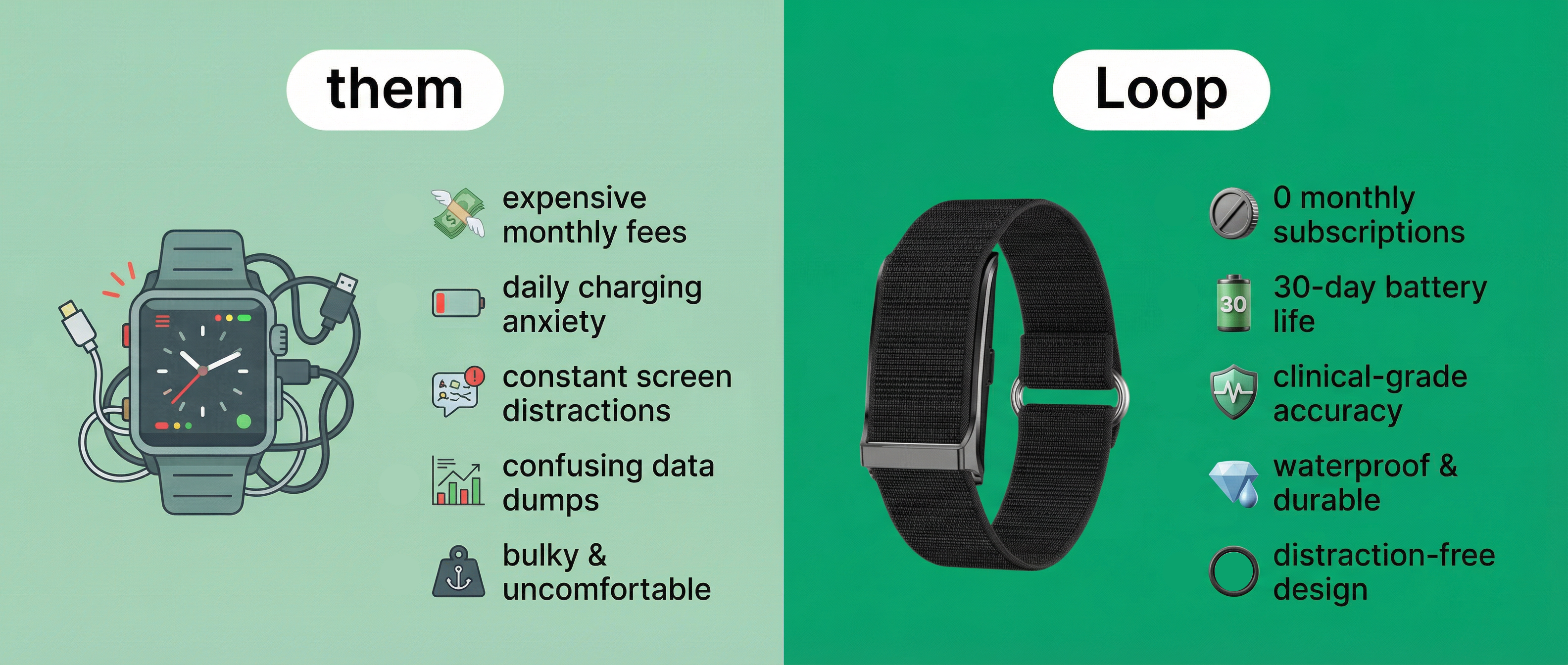 We believe health tracking shouldn't create digital waste or mental clutter. Unlike smartwatches that need daily charging and demand your attention, Loop is designed to be invisible. With a 30-day battery life and no screen, we minimize energy consumption and eliminate the "digital pollution" of constant notifications.